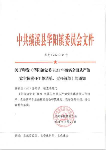 “明確6個方面責任內容細化27條措施壓實班子成員和相關部門責任,針對上級點的、日常工作中發現的、民主生活會查擺出的問題,對癥下藥,提出相應的整改措施,確保全面從嚴治黨縱深推進……”近日,華陽鎮印發《2021年落實全面從嚴治黨主體責任工作清單、責任清單》,建立完善全面從嚴治黨主體責任工作清單、責任清單、時限清單,明確了黨委書記、領導班子成員、各相關部門的責任,著力構建職責明晰、目標具體的責任體系,推動“兩個責任”貫通聯動、一體履行。